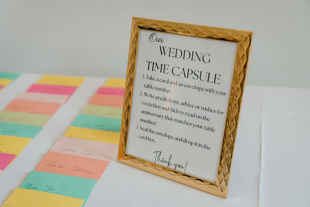 This one is easily our favorite since it can be incorporated into any wedding regardless of style, location, or flow. It’s such a personal touch to your wedding day that will be fruitful for many years to come. Whether it’s one card per table, or one card per person, the idea is that whatever number table a guest is sitting at, is the anniversary year they will write you a note for. For example, if a guest is sitting at table 5, they would write a note to the couple for their 5th wedding anniversary. These notes can be congratulations, advice, or a date night idea. It’s a great way to add some personal touches to your day and incorporate your guests into your marriage for years to come.